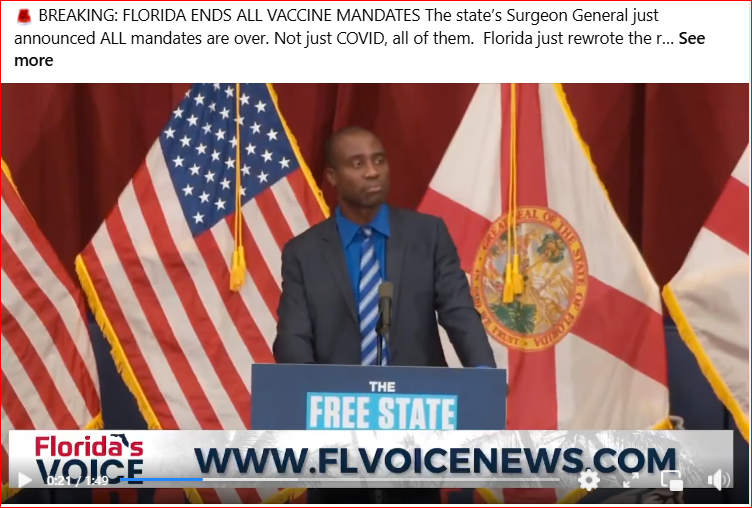 The Florida Department of Health, in partnership with the governor, is going to be working to end all vaccine mandates in Florida. Every last one of them. (link)